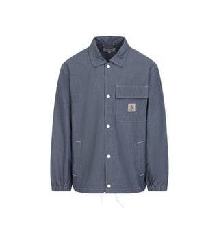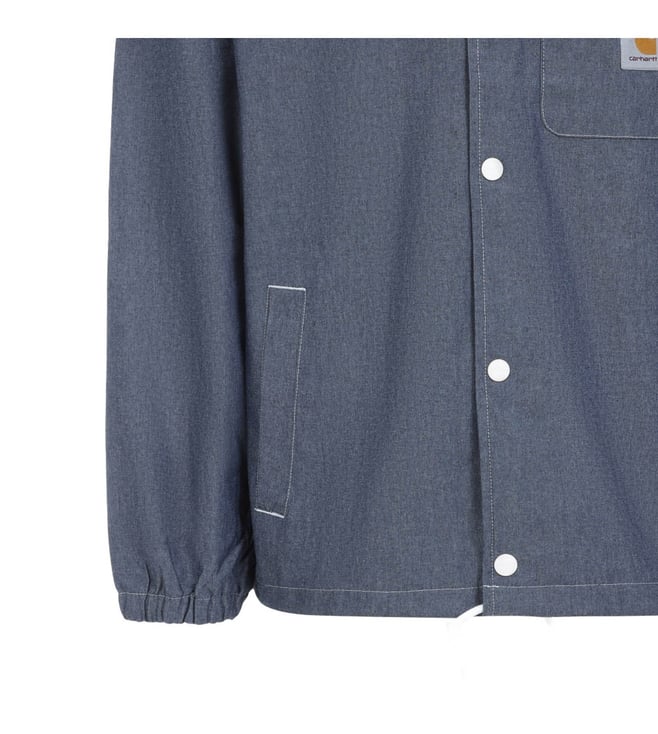 Elevate your style with the Carhartt Blue Coach Oversized Fit Jacket. Carhartt wip black coach blue polyester jacket. Crafted from blue cottonblend, pointed collar, snap button fastening, flap pocket with logo detail on the breast, two front pockets, dropped shoulders, long sleeves, elastic cuffs, straight hem with concealed drawstring.
