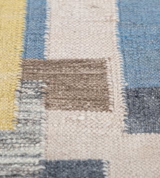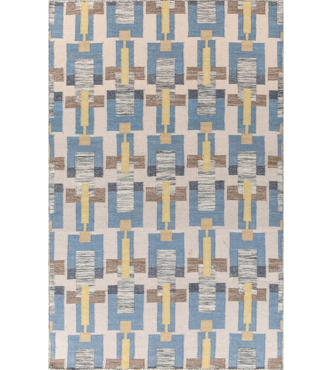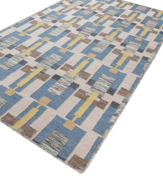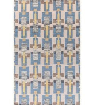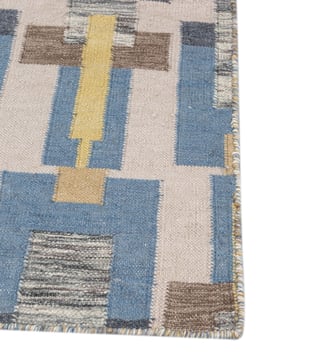 Handwoven in Jaipur, this wool rug's serene blue hue evokes a calming sky. Its intricate flat weave adds textural depth, while its 5x8 ft size provides ample coverage. Lightweight and easy to move, this handcrafted treasure infuses your space with timeless elegance and luxurious comfort.