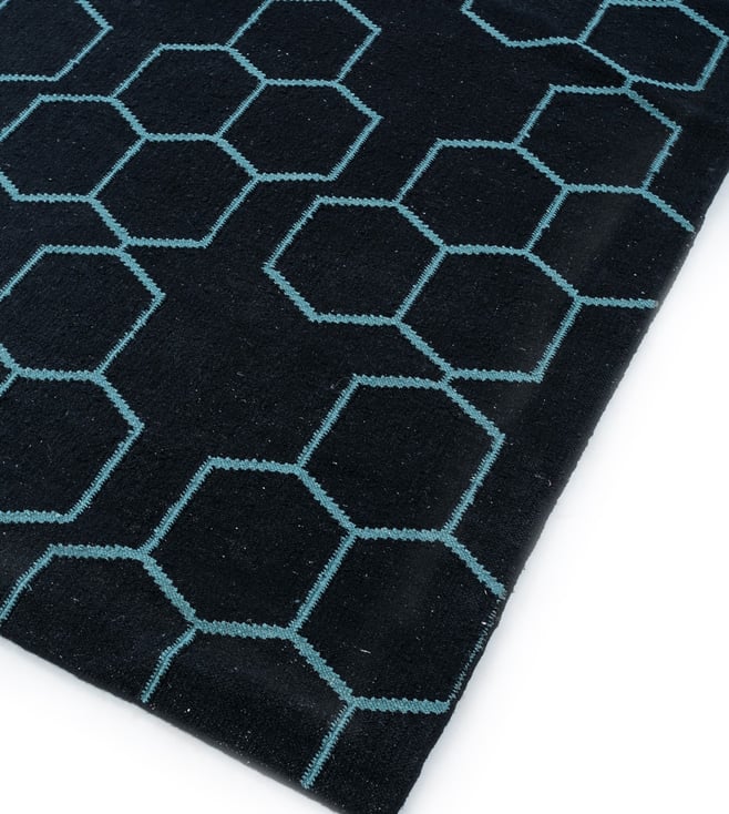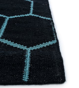 A symphony of midnight and sapphire, this handwoven wool rug transforms your space into a haven of sophistication. Its intricate flat weave, crafted with meticulous detail, showcases a captivating interplay of black and blue hues. The 5x8 ft rectangle effortlessly anchors your living room or bedroom, adding a touch of timeless elegance. Its substantial weight (4.4 kgs) speaks to its quality and durability, ensuring years of luxurious comfort underfoot.