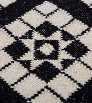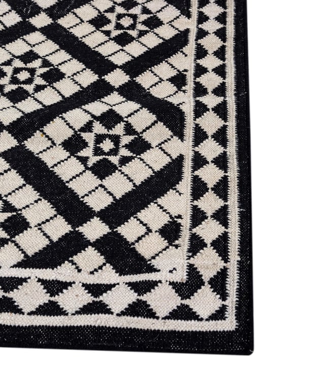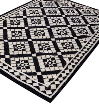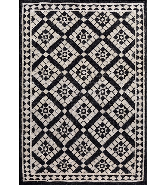 A symphony of black wool, this Jaipur rug transforms your living room or bedroom into a haven of understated elegance. Its flat weave, crafted with meticulous precision, creates a subtle texture that invites bare feet. The rectangular shape, measuring 5x8 feet, anchors the space with a sense of calm and sophistication. Weighing in at 4.4 kgs, this rug feels substantial yet effortlessly blends into any d¿cor, adding a touch of timeless luxury to your sanctuary.