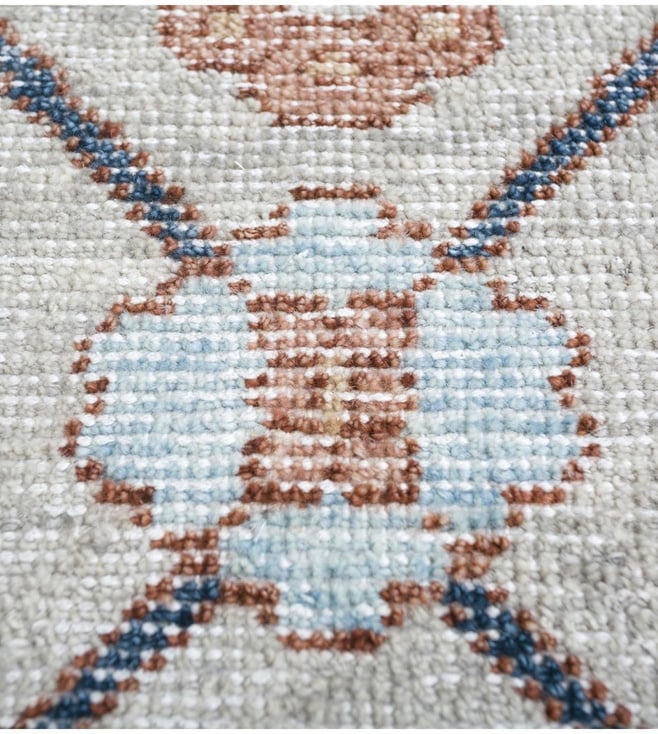 Featuring modern designs with a touch of heritage, this carpet is a delight to look at. Hand-knotted using the finest yarns, the exquisite carpet is sure to add unparalleled elegance to any room. Use it as a centrepiece in your traditional living room or with vintage furniture. It is sure to compliment marble or wooden floors in homes or creative spaces. It has been crafted with care using wool. Disclaimer: Product colour may slightly vary due to photographic lighting sources. Country of Origin - India.