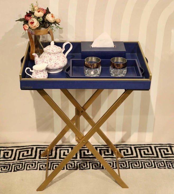 Ink Blue Pu Leather Foldable Tray with Metal Stand, Small Tray and Tissue Box