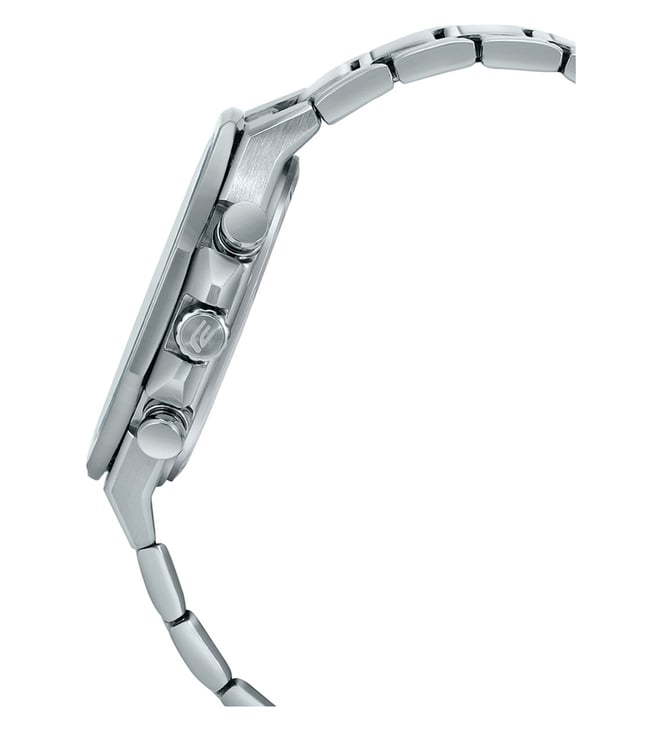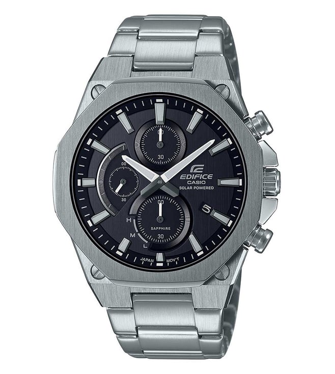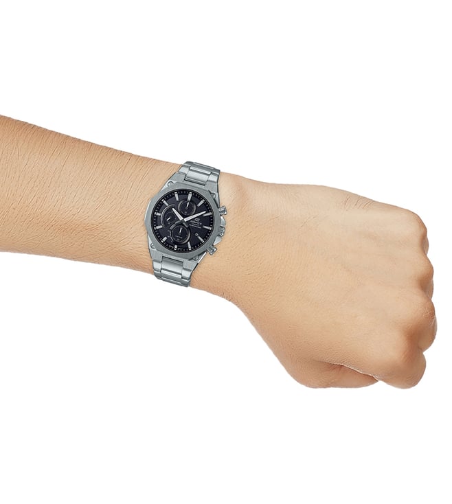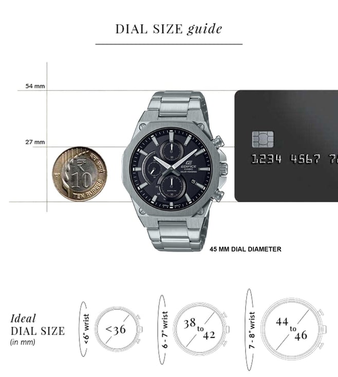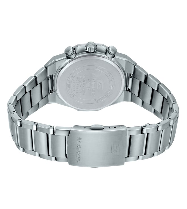 Carry great technology wrapped around your wrist with this stylish men's analog watch from Casio Edifice. The black round dial is protected by a sapphire glass. The stainless steel strap comes in a silver hue that further elevates the look of the timekeeper. Besides, it is completed with a fold over push button clasp with safety clasp to ensure a secure fit on the wrist.