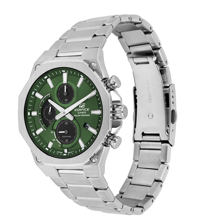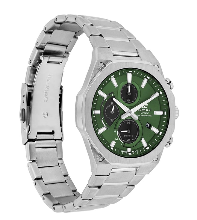 A seamless fusion of design and precision, this watch features a sleek profile with a 9.7 mm case thickness that enhances comfort and wearability. The flat bezel, crafted with a fine hairline finish, adds a distinctive touch, complementing the multi-hand chronograph display. Powered by solar technology, it ensures reliable functionality without frequent battery changes. A scratch-resistant sapphire crystal protects the dial, offering long-lasting clarity.