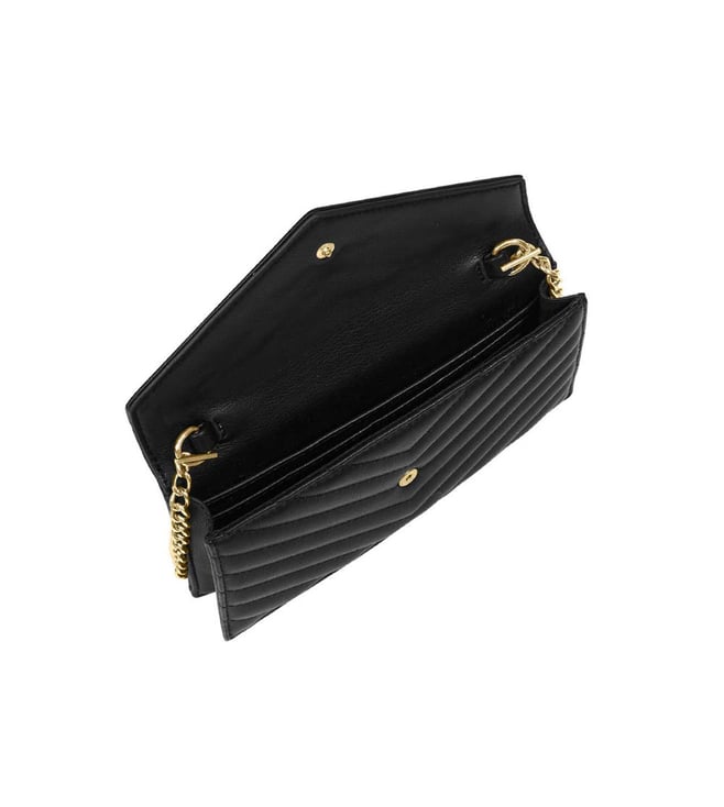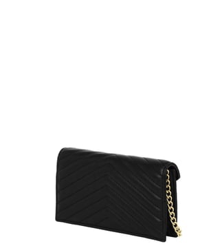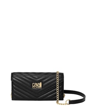 Cavalli class black valeria mini crossbody bag crafted in synthetic leather and polyurethane featuring snap closure, 1 compartment, inside card slots, metal logo, chain-link crossbody strap. Products purchased from Darveys are supported exclusively by the warranty/exchange policies of Darveys and its partner boutiques. Brand owners and their channel partners are not responsible for exchange/warranty services for items purchased through Darveys.