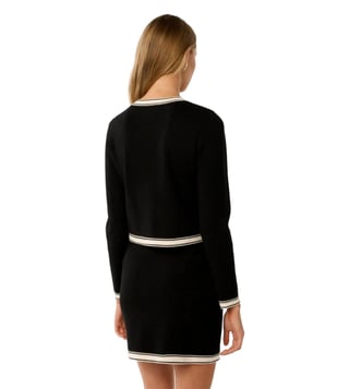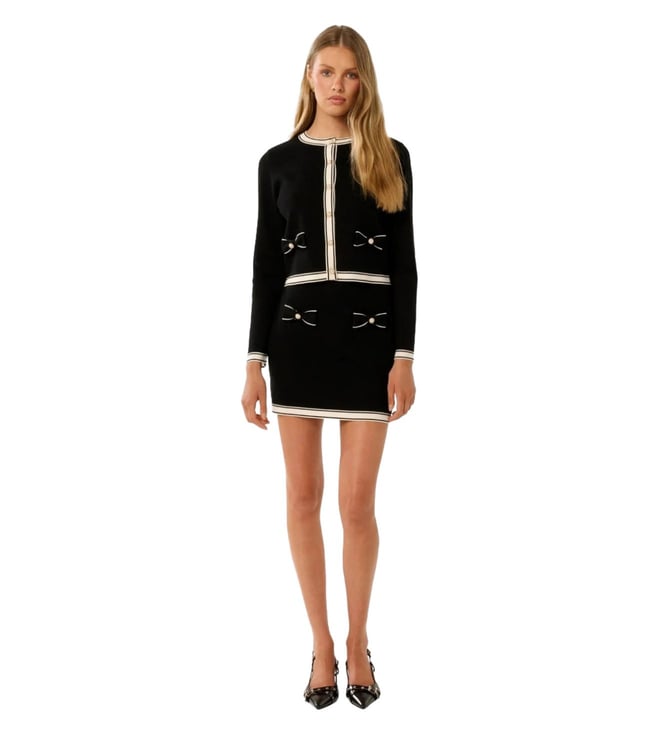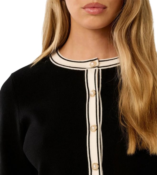 Forever New Cece Bow Detail Cardigan adds a touch of elegance to everyday style with its preppy yet feminine design. Crafted from a soft knit blend containing at least 50percent LENZING ECOVERO viscose, it offers a sustainable and comfortable feel. The regular-fit silhouette features a high round neckline, long sleeves, contrast trim, and delicate bow embellishments. Finished with pearl bead buttons, this cardigan brings a refined charm to both casual and dressy looks.