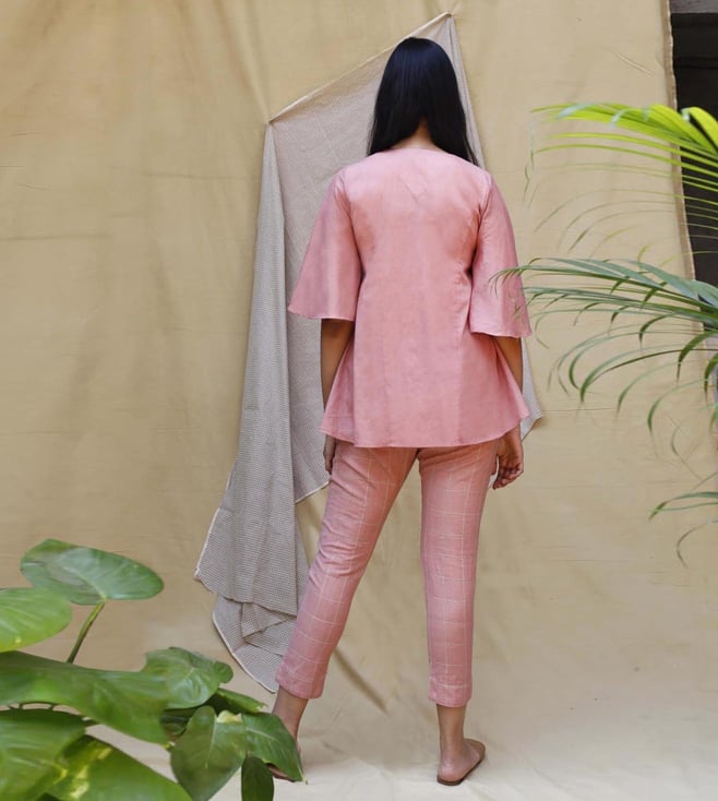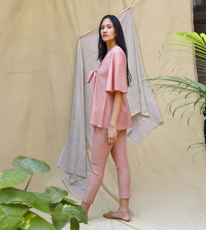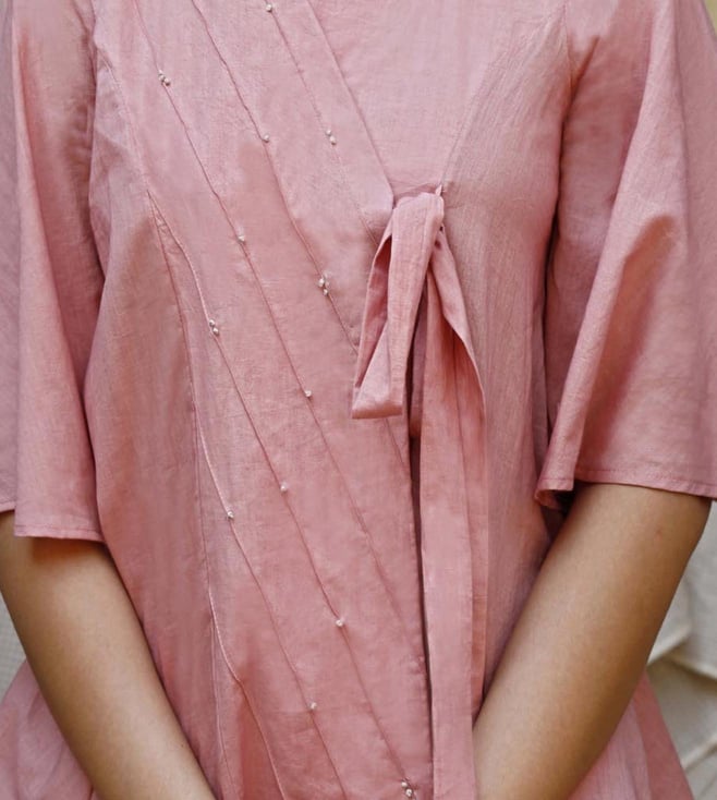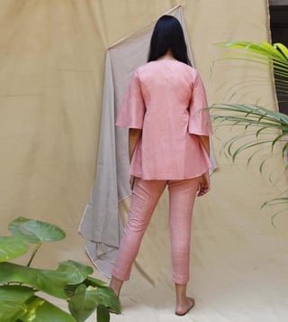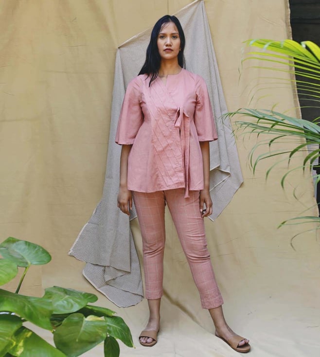 This timeless yet cheerful top is skin-friendly and is designed to stand out and yet keep you comfortable. Wear this as a basic staple in your wardrobe that you can dress up or down as you please. It has an overlapped style with belt tie up on the side, statement sleeves and tucks and embroidery details on the front panel. It has been made using hand spun cotton. Disclaimer: All other items in the image are only for display purposes and will not be a part of the delivery content. Product colour may slightly vary due to photographic lighting sources. Country Of Origin - India.