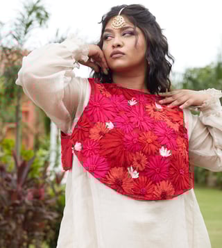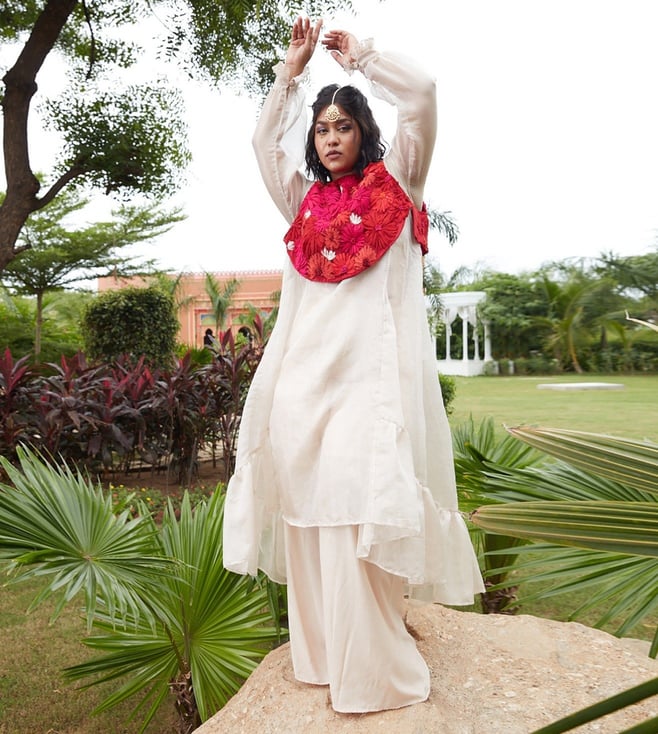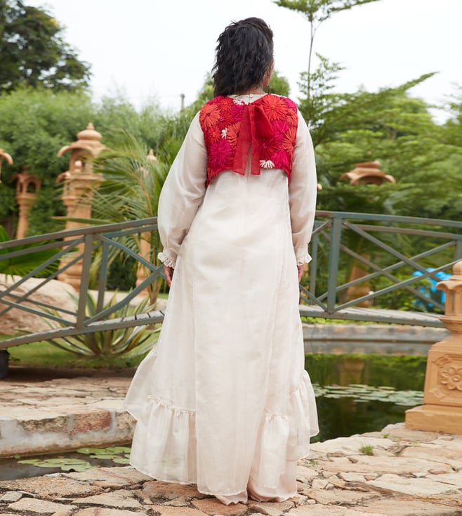 Step into a world of artistic marvels that seamlessly weaves vintage Renaissance charm with the timeless allure of Indian aesthetics in this dress, koti and pants set. It is made with pure silk kota tissue and all weather pure silk. The jacket features intricate fabric and thread embroidery. The pants have an elasticated back with a concealed drawstring in the front. Disclaimer: Product colour may slightly vary due to photographic lighting sources. Country of Origin - India.