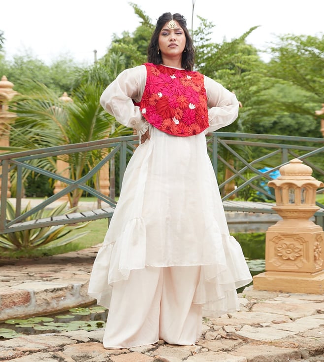 Chambray & Co Red, Pink, Orange & Silver Ghazal Dress with Jacket and Pants
