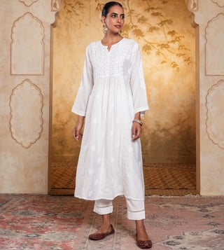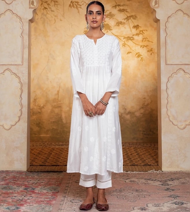 House of ChikankariChanderi Chikankari Solid Women's Long Kurta - White