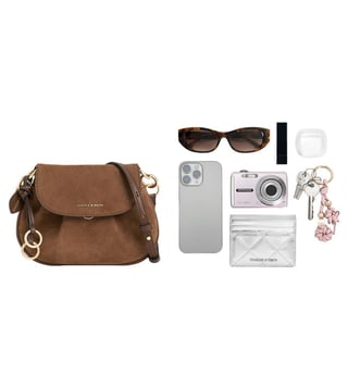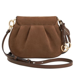 This Britton bag in mocha brown is made with recycled suede and features a ruched body, curved silhouette and a striking detachable keychain. Carry it with matching earth-tone pieces for a refined tonal ensemble. Recycled suede requires a little extra care. After each use, gently brush the surface in one direction with a soft brush to remove dust and dirt. For stubborn stains, lightly dampen a cloth with a mild cleaning solution and gently rub the fabric until the stain is gone.