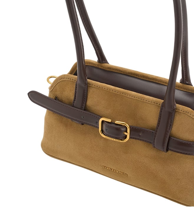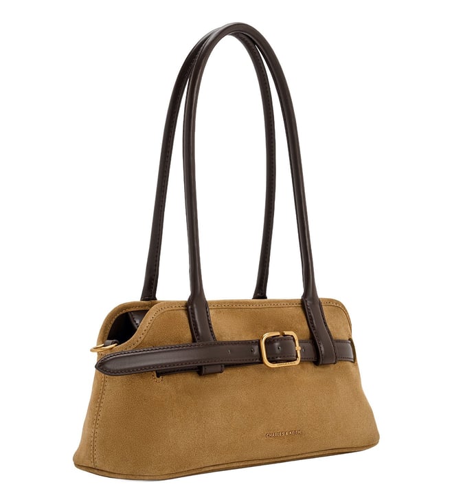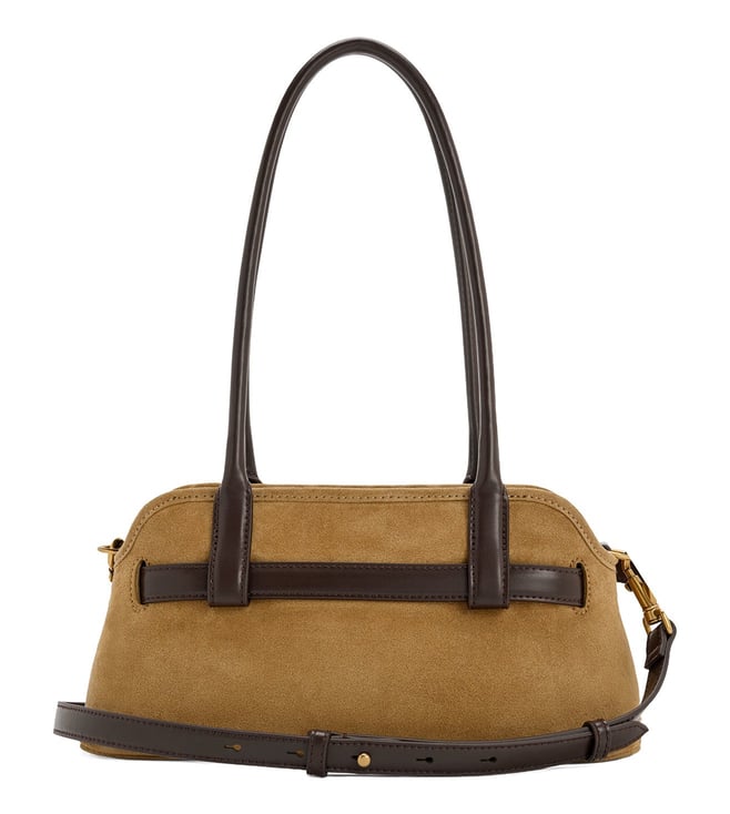 This Victoria shoulder bag in sand is made with recycled suede and features a belted detail and elongated silhouette. Use it to complement minimalist separates and let it be the polished star of your outfit.