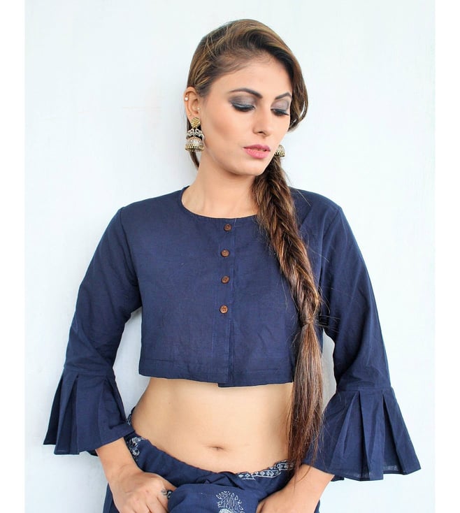 Augment your look by wearing this blue blouse from Chidiyaa. Tailored to sartorial perfection from premium quality cotton fabric, it assures a soft and soothing touch against the skin. This blouse is the go to staple piece to be paired with saree or dhoti pants and lehenga. Disclaimer : All other items in the image are only for display purposes and will not be a part of the delivery content. Product color may slightly vary due to photographic lighting sources.
