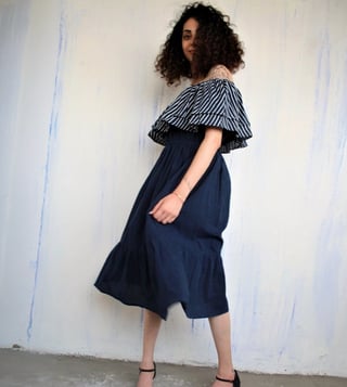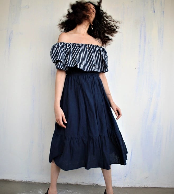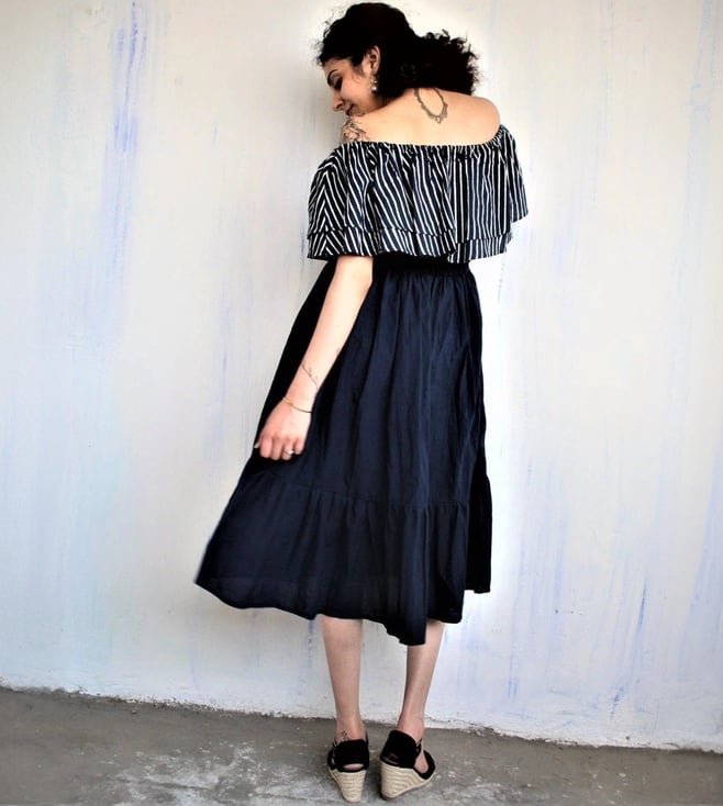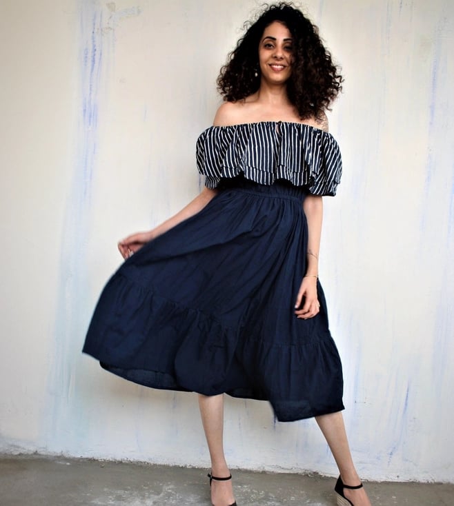 Rekindle your inner style quotient by wearing this blue dress from Chidiyaa. Crafted using premium quality cotton fabric, it will be very soft to the skin. The off shoulder adds to its appeal. Exuding off- shoulder and striped pattern, it is sure to fetch you compliments from all. Country of Origin - India. Disclaimer: All other items in the image are only for display purposes and will not be a part of the delivery content. Product colour may slightly vary due to photographic lighting sources.