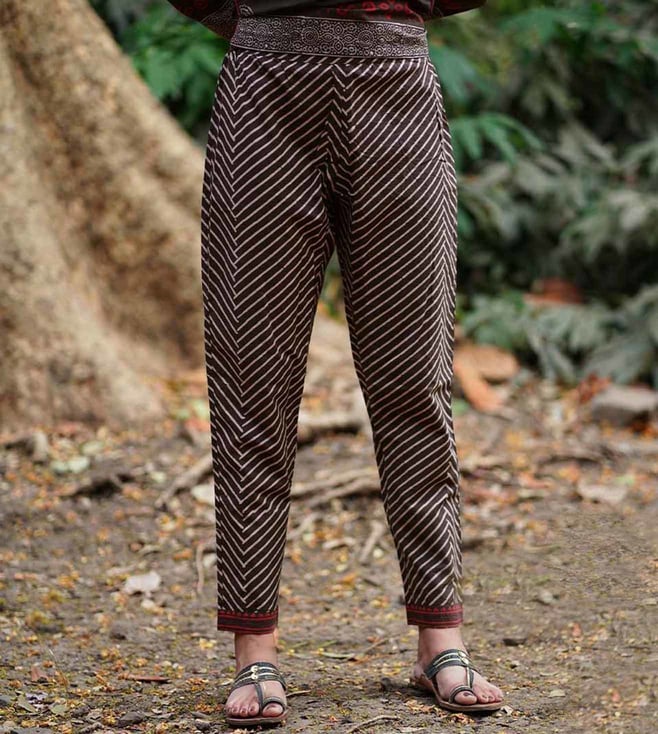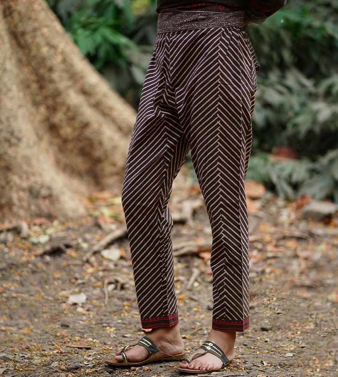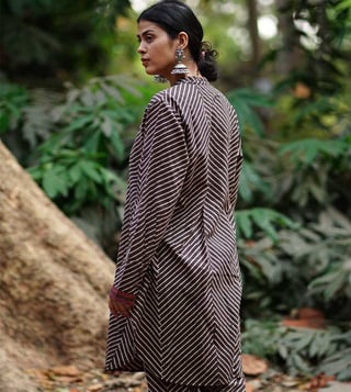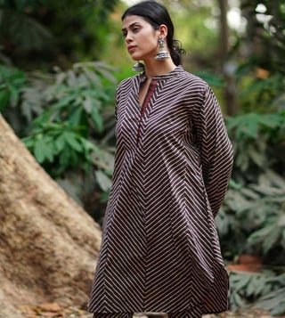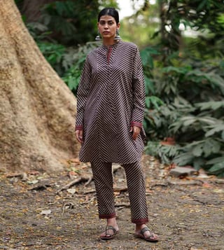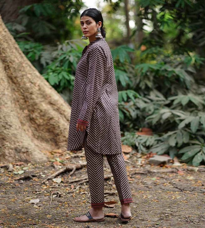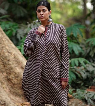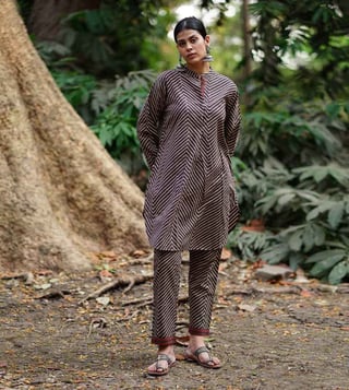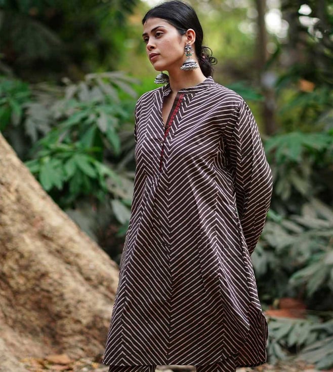 Drown into the earthy tranquility of our new Whistling Woods collection with this stunning Jharna Si Tu Brown Block Printed Cotton Kurta set. Crafted from high-quality, breathable cotton, it provides a remarkable balance of comfort and style, making it ideal for embracing the tranquil atmosphere of a woodland retreat. A dramatic pattern of white geometric lines, painstakingly crafted to imitate natural textures and modern minimalism, is displayed on a rich, deep brown canvas.
