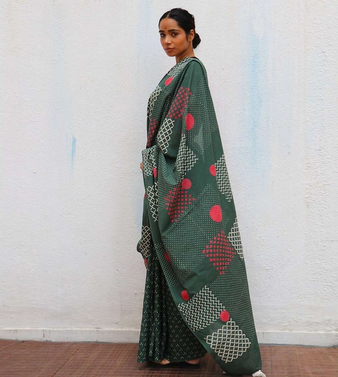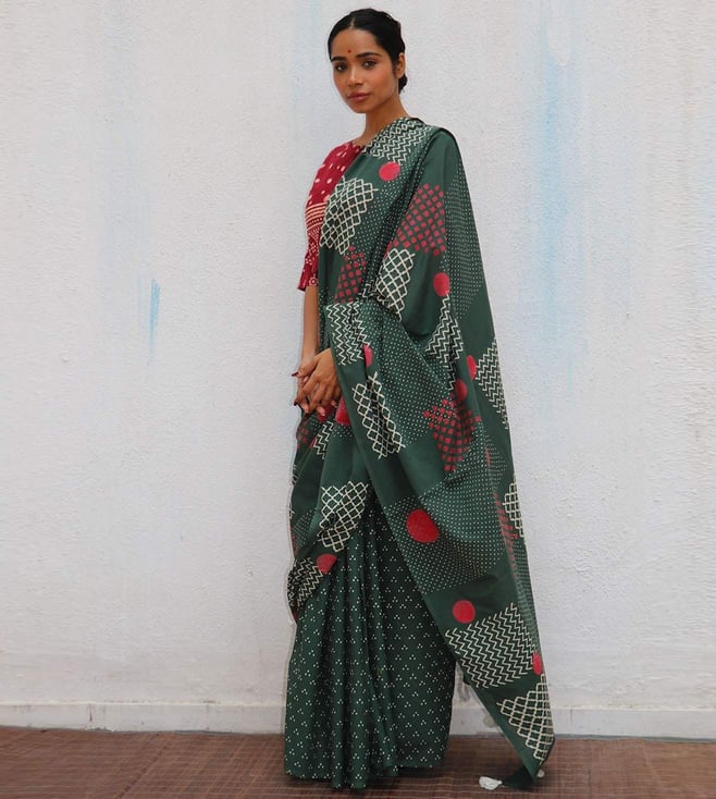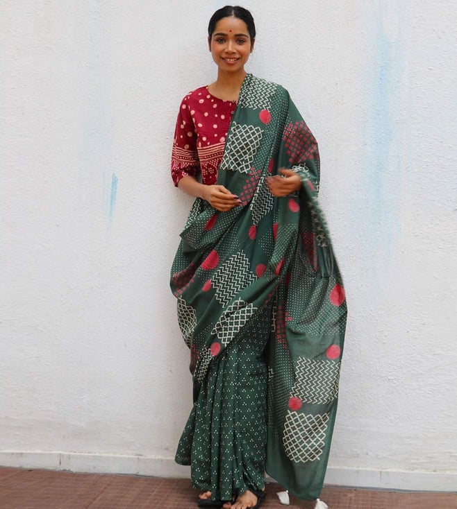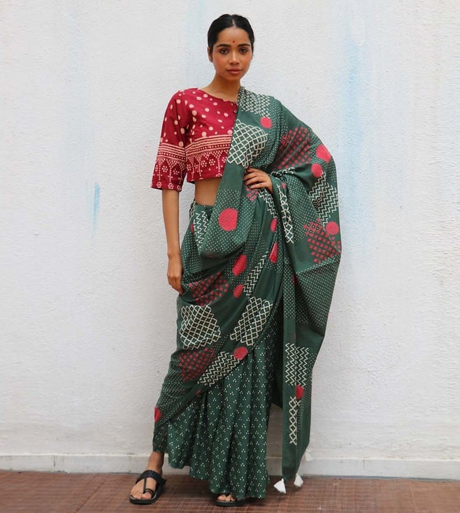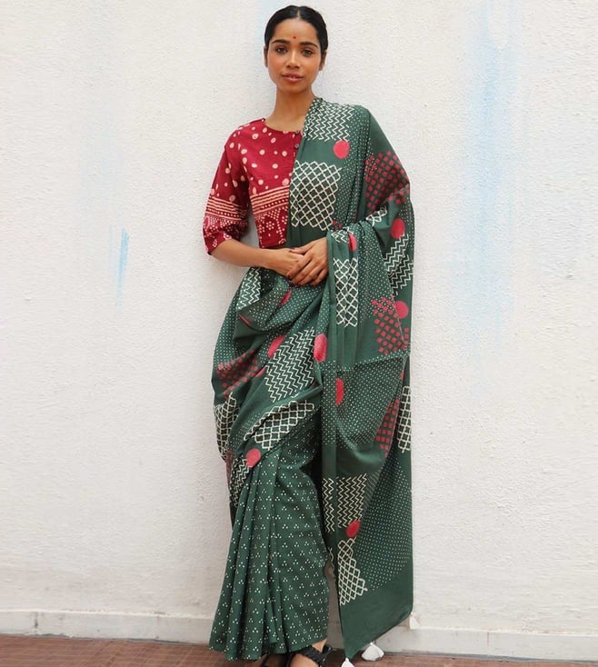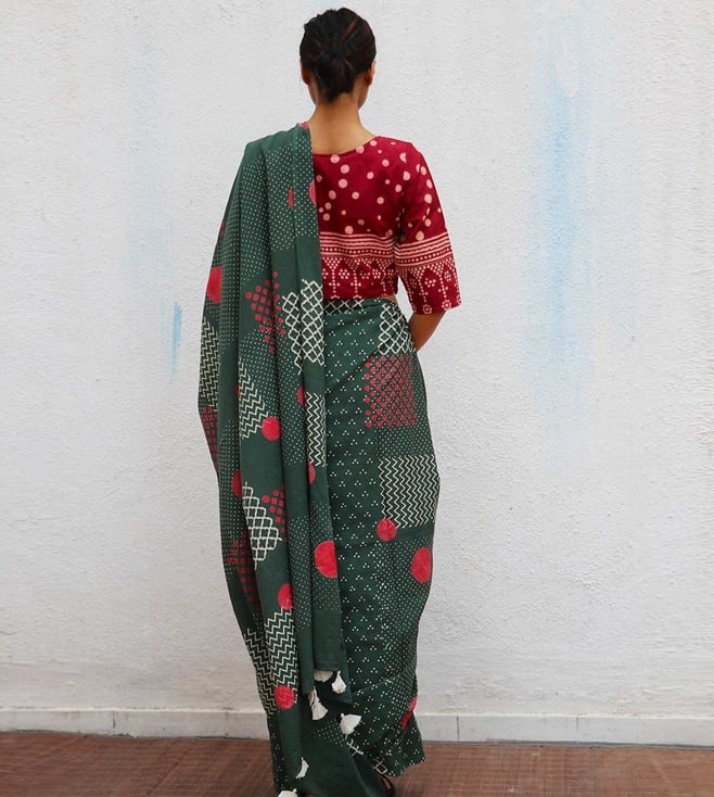 Chidiyaa Green Paakhi Juliet's Waltz Handblock Printed Cotton Saree