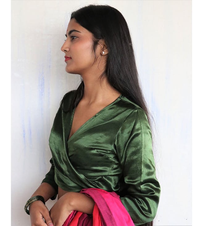 Let people applaud you for your impeccable choice as you don this green blouse from Chidiyaa. Tailored to sartorial perfection from premium quality fabric, it assures a soft and soothing touch against the skin. The v neck adds to its appeal. Get that energy boost with this youthful silhouette. Disclaimer: All other items in the image are only for display purposes and will not be a part of the delivery content. Product color may slightly vary due to photographic lighting sources.