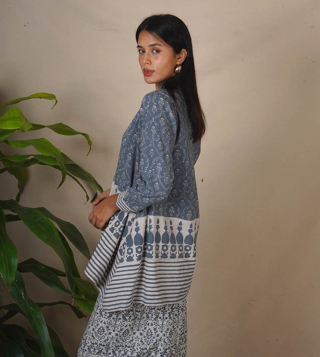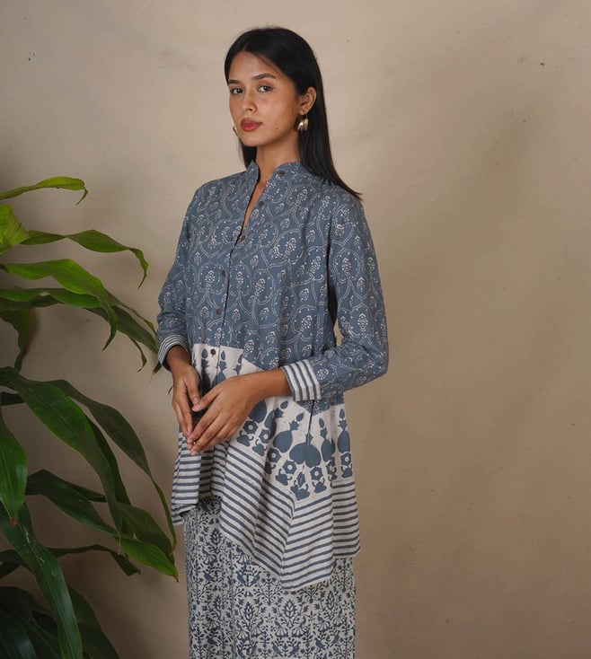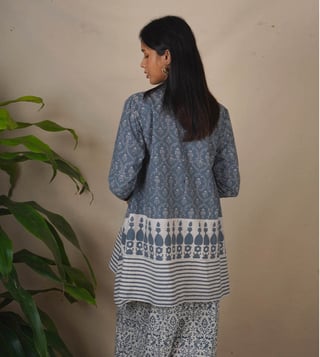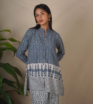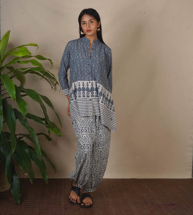 Clean cuts, airy cotton, and subtle prints define the Ashen Shore Grey Block Printed Top, a must-have in any modern wardrobe. This top for women is designed in a relaxed silhouette, with gentle block motifs that speak of artisanal finesse. Whether you pair it with ethnic pants type women silhouettes or modern denim, the styling possibilities are endless.