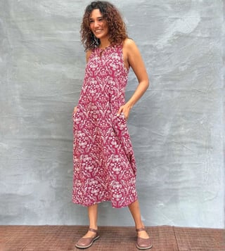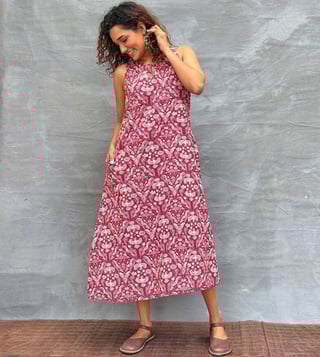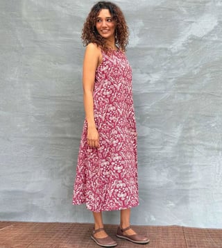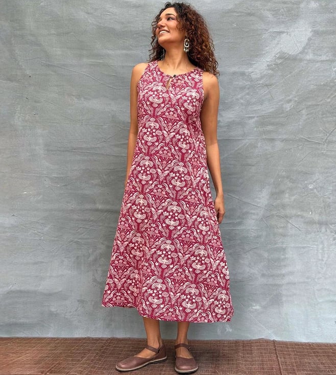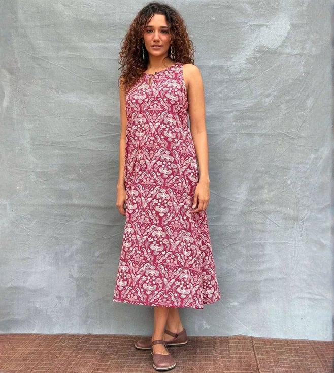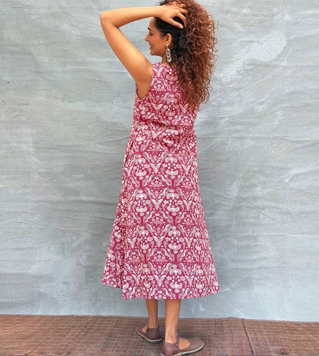 Chidiyaa Maroon Soil Feathered Grace Blockprinted Cotton Dress