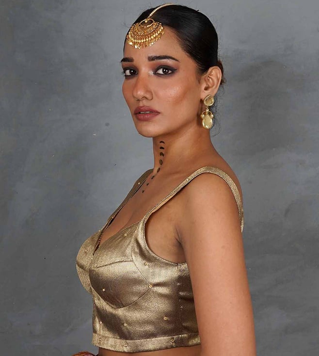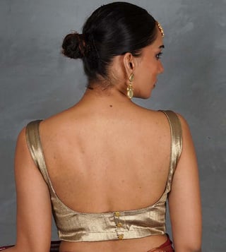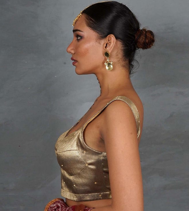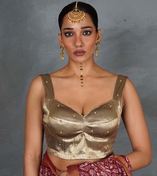 Add a touch of regal elegance to your ethnic wardrobe with this stunning Matlic sleeveless silk blouse. Crafted from high-quality silk fabric, this blouse features a structured sweetheart neckline that beautifully flatters the silhouette. Subtle golden embellishments scattered across the bodice lend a delicate shimmer, making it perfect for festive occasions and celebrations. The blouse pairs seamlessly with sarees, lehengas, or ethnic skirts and comes with a rich maroon dupatta featuring intricate floral motifs and a golden zari border, completing the luxurious traditional look.