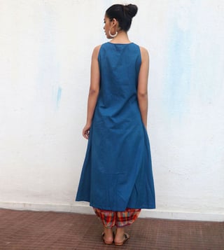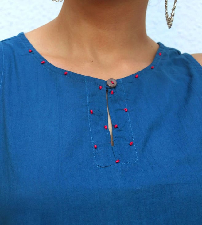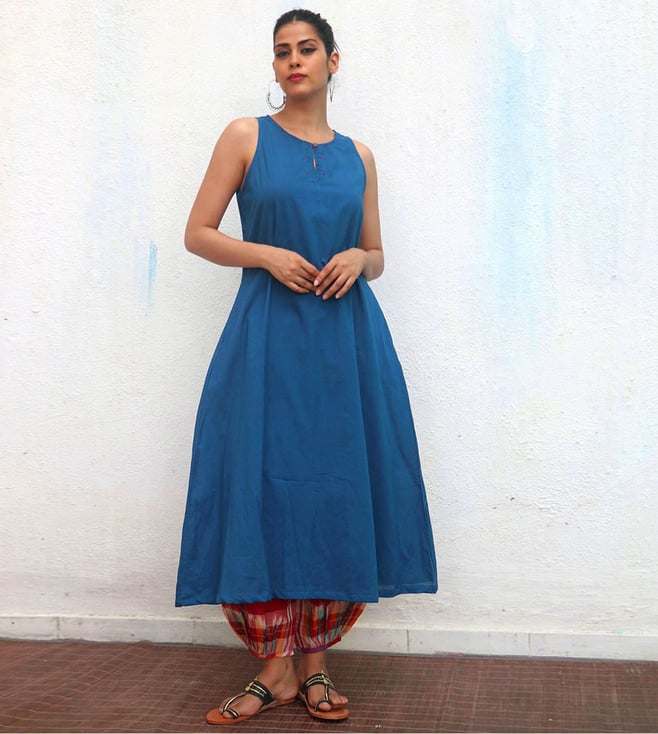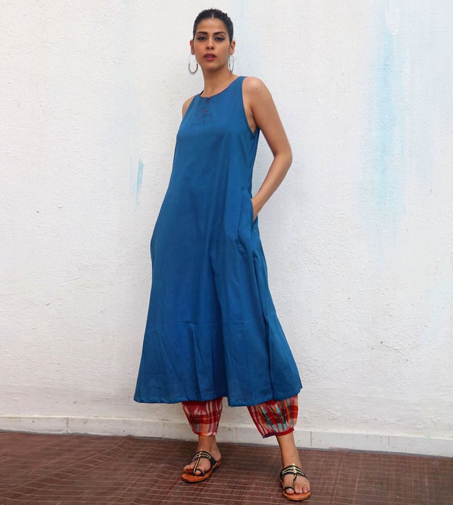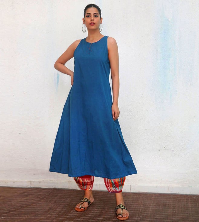Bring a touch of elegance and comfort to any occasion with this Blue Sleeveless Pure Cotton Kurta by Chidiyaa. Perfect for women, this kurta is made from high-quality pure cotton fabric. Add a pop of colour to your wardrobe with this versatile and stylish piece.' Disclaimer: All other items in the image are only for display purposes and will not be a part of the delivery content. Product colour may slightly vary due to photographic lighting sources. Country of Origin - India.