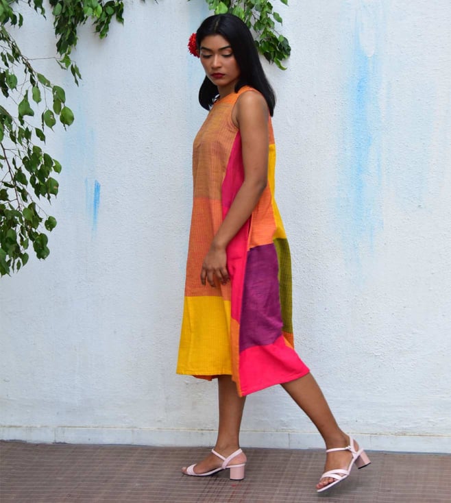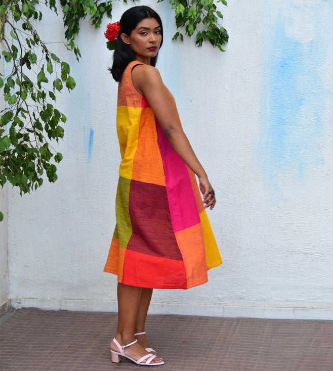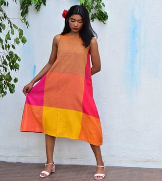 This handwoven and hand-dyed dress is a fun and playful addition to any wardrobe. Disclaimer - It is one of a kind and the colour of each block may differ from the one in the photograph. It has comfortable pockets. It is made of cotton. Product colour may slightly vary due to photographic lighting sources. Country of Origin - India.
