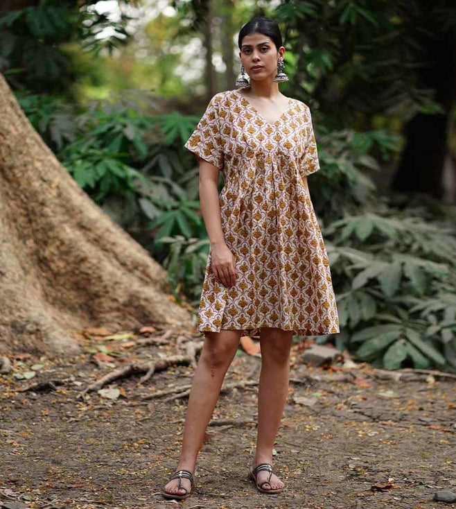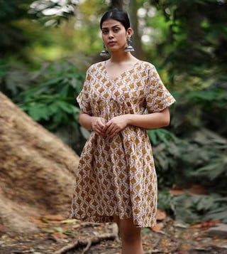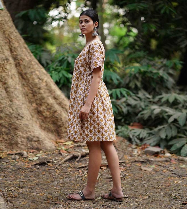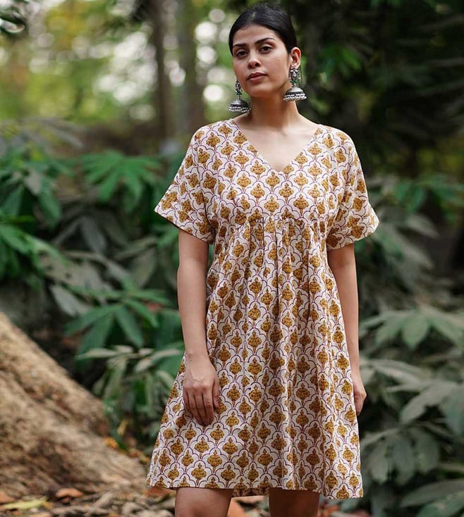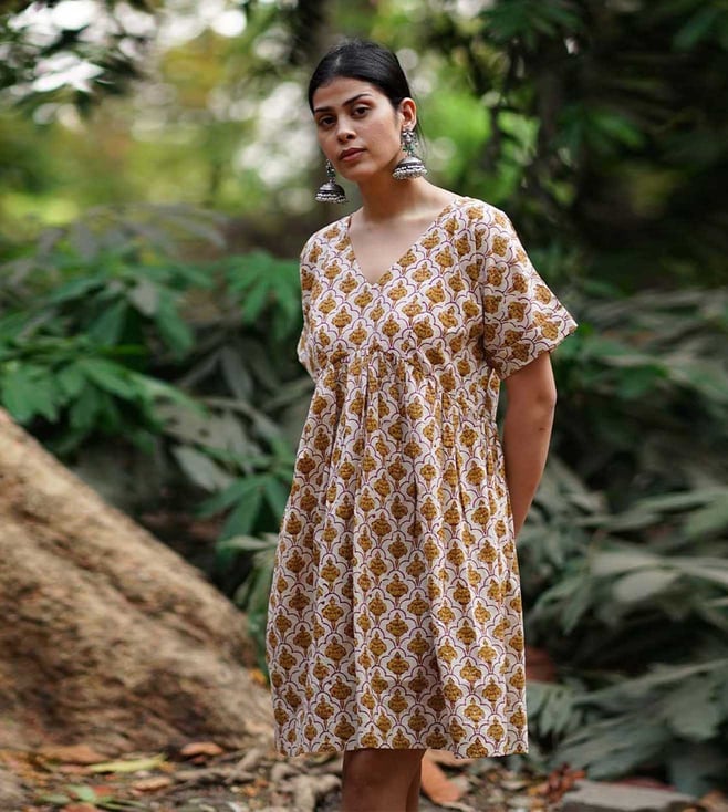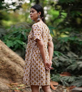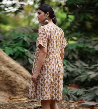 Presenting the new Whistling Woods Collection's, Tu Dilruba Ivory Block Printed Cotton Dress, a tasteful fusion of natural hues and carefree style. This dress, which is made of lightweight, breathable cotton, has warm mustard highlights that subtly contrast with a soft white background that evokes the paths of a sunny woodland. The short silhouette provides a loose, attractive fit that is ideal for breezy evenings and daytime explorations. The natural color scheme anchors the ensemble in rustic appeal, while delicate pleats and careful stitching provide texture and movement.