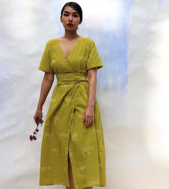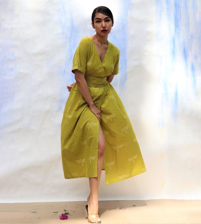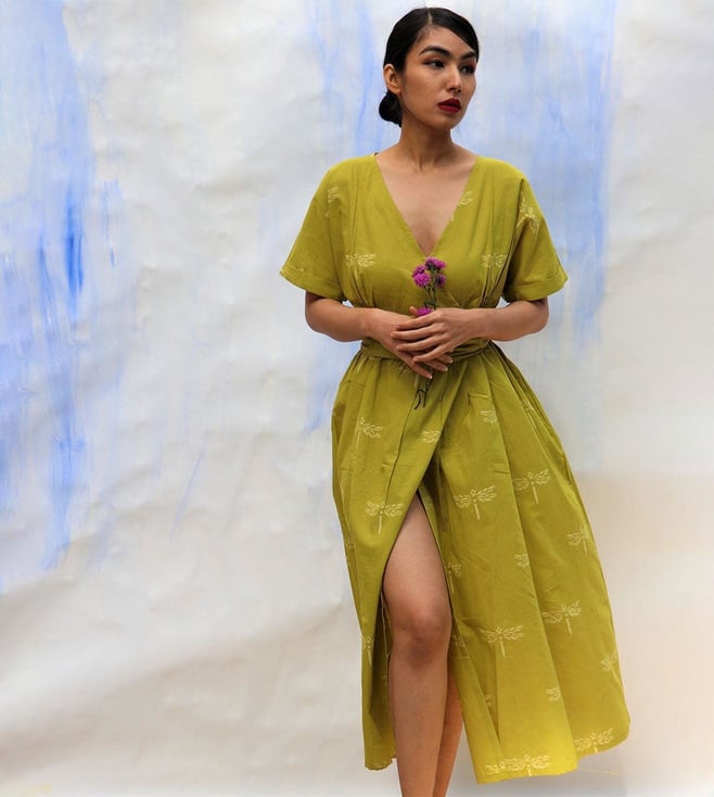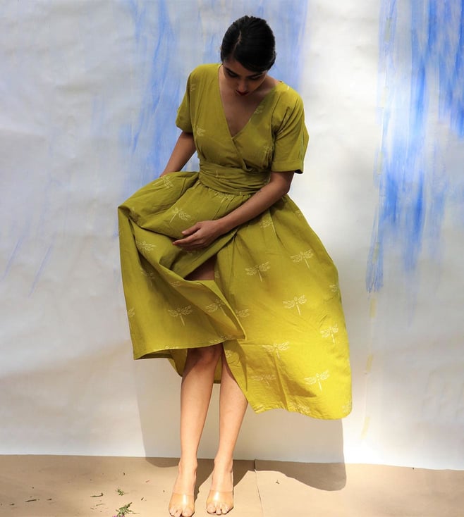 Parrot Green Handprinted V Neck Pure Cotton Dress SKD