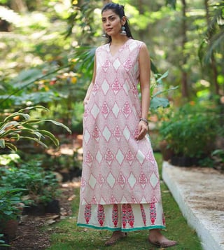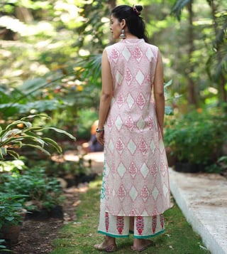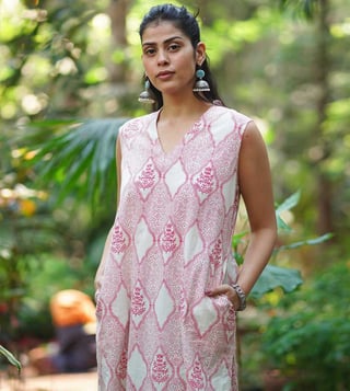 Let your wardrobe bloom with Nargis? Noor, a blush pink sleeveless cotton kurti that shines with subtle charm and a modern twist. Featuring a graceful V-neckline and a contemporary diamond-shaped print, this kurti is an ode to effortless elegance. The soft blush pink offers a dreamy backdrop, while the sleeveless silhouette keeps things breathable and fresh. The lightweight cotton fabric makes it a reliable companion for warm days and busy schedules. Pair it with contrasting leggings or wide-blush-pinke-leg pants for a fusion look that? both comfortable and chic.