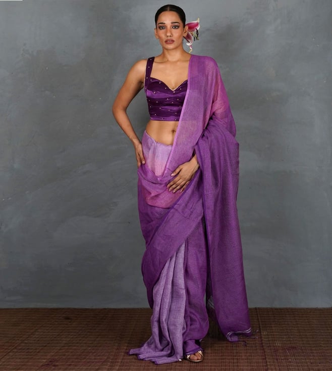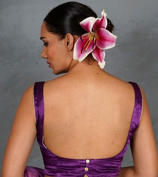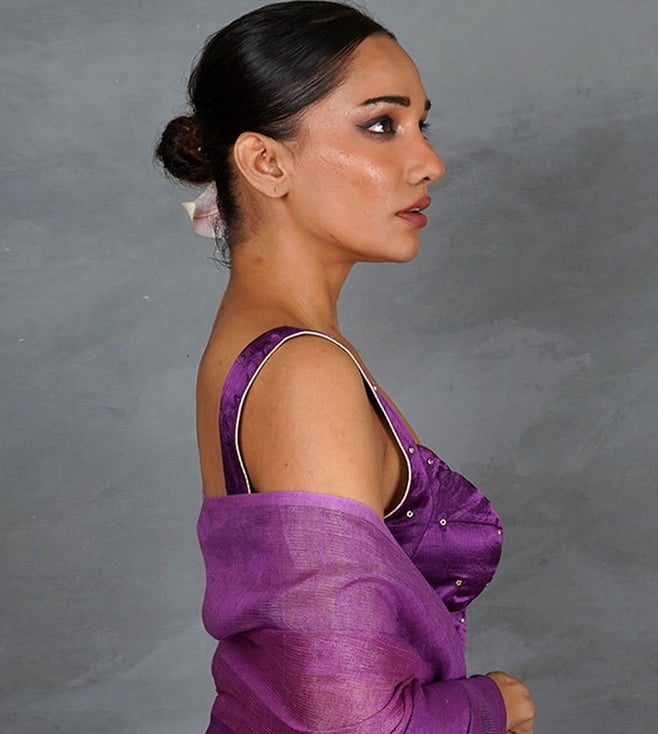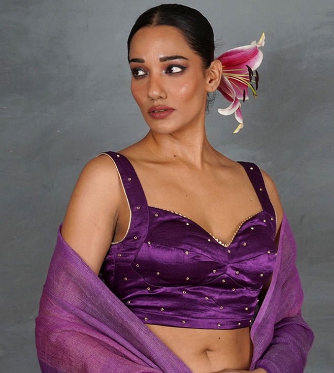 Turn heads in this luxurious royal purple silk blouse, designed with a modern cut that blends elegance and comfort. Featuring a sweetheart neckline, broad straps, and subtle golden stud embellishments, this blouse is perfect for festive occasions, weddings, and evening parties. Its structured silhouette offers a flattering fit, while the rich sheen of silk adds timeless glamour. Complete the look with statement earrings and a drape in contrasting or tonal shades for effortless elegance.