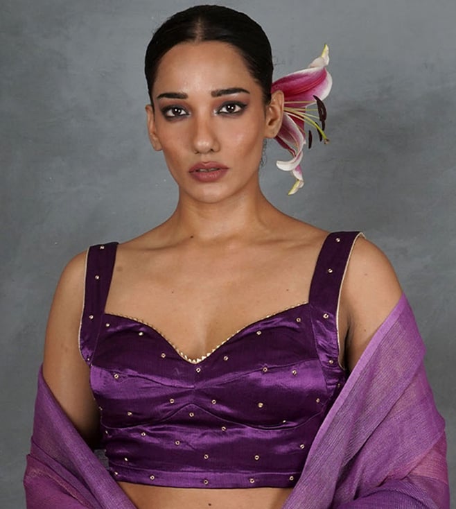 Turn heads in this luxurious royal purple silk blouse, designed with a modern cut that blends elegance and comfort. Featuring a sweetheart neckline, broad straps, and subtle golden stud embellishments, this blouse is perfect for festive occasions, weddings, and evening parties. Its structured silhouette offers a flattering fit, while the rich sheen of silk adds timeless glamour. Complete the look with statement earrings and a drape in contrasting or tonal shades for effortless elegance.