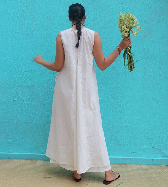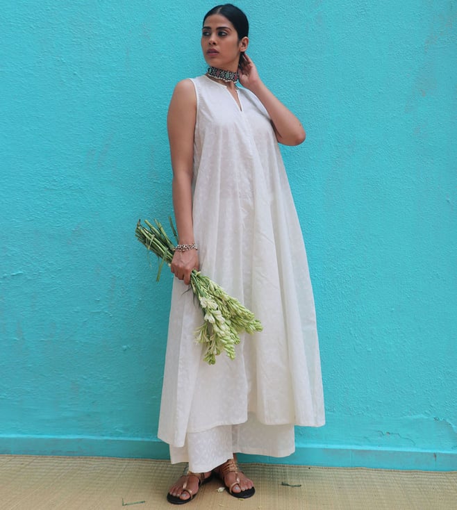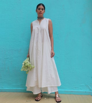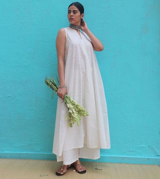 Chidiyaa Safed Pakeezah Cotton Kurta Set is a white, sleeveless kurta set for women. Made from cotton, it is perfect for daily wear. The set includes a kurta and a pair of pants. The kurta is sleeveless and has a round neckline. The pants are ankle-length and have a drawstring waist. The set is available in white. Disclaimer: All other items in the image are only for display purposes and will not be a part of the delivery content. Product colour may slightly vary due to photographic lighting sources. Country of Origin - India.