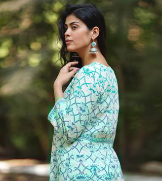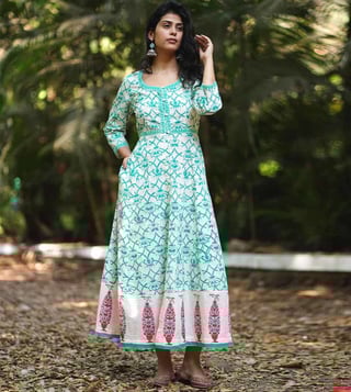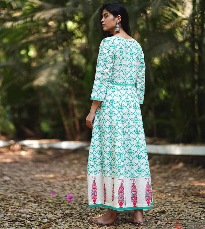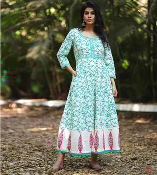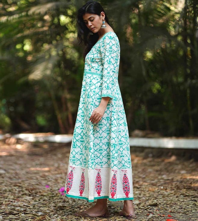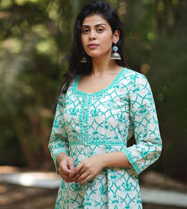 Feel like a breeze in our Chamomile Calm white & teal cotton dress, tailored for summer with soft cotton. Its flared silhouette and dainty floral prints make it perfect for brunches, vacations, or even barefoot beach walks. this dress women strikes the perfect balance between elegance and playfulness. It?s not just another addition to your wardrobe?it?s a summer essential designed to elevate your summer fashion game. If you're curating a wardrobe of summer season clothes, this dress belongs at the top of your list.