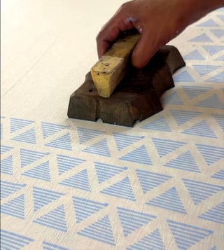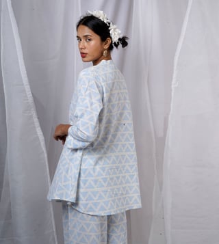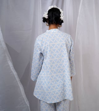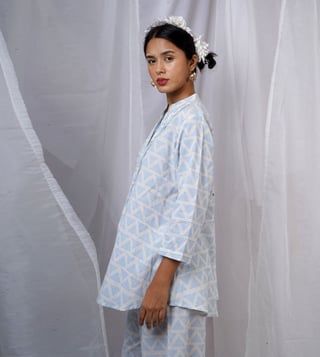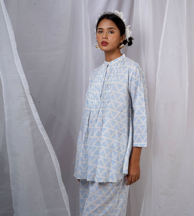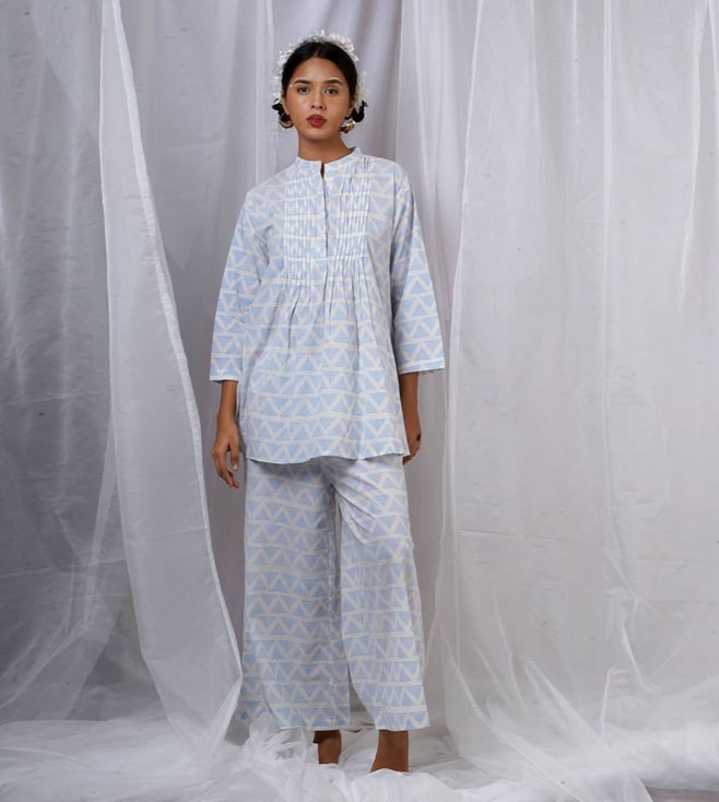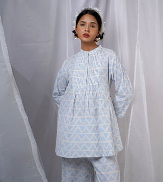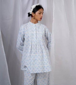Beautiful handblock printed outfit features a coordinated two-piece set in a soft, pastel blue and white geometric print. The top is a relaxed-fit tunic with three-quarter sleeves and a band collar, enhanced with fine pintuck detailing on the front for added texture and elegance. It has a breezy, comfortable silhouette, perfect for casual or lounge wear. The matching pants are wide-legged and ankle-length, offering ease of movement and a relaxed yet stylish look.