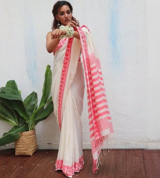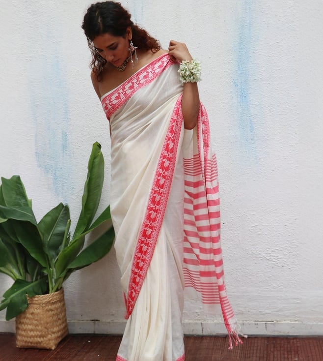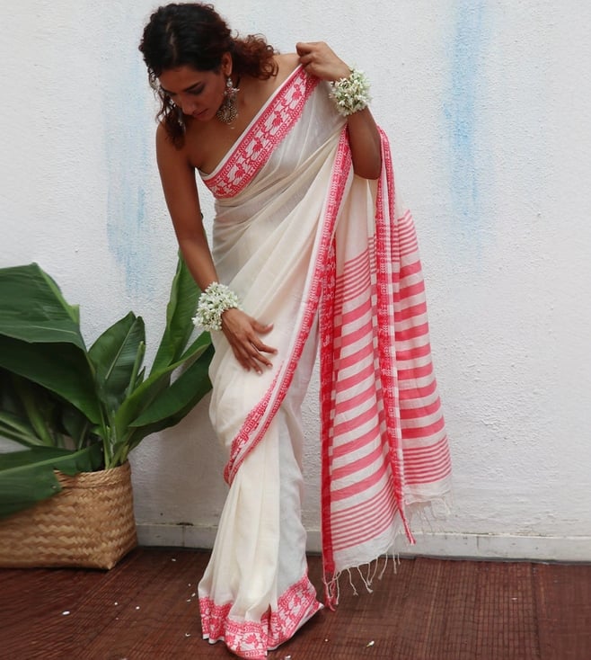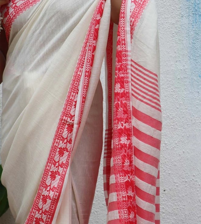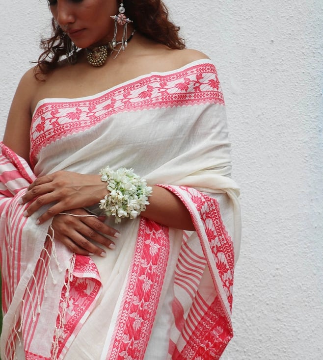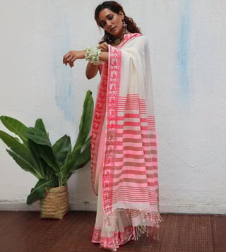 Chidiyaa White Uma Trinetra Handwoven Linen Cotton Jamdani Saree