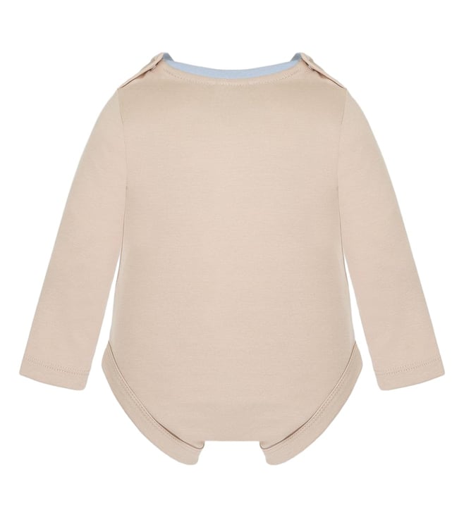 Crafted from soft, natural cotton, this beige Teddy Bodysuit offers gentle comfort for your baby boy. The delicate applique detail adds subtle charm, while the blue piping at the collar provides an elegant contrast. Designed for everyday wear, it combines style and practicality with breathable fabric and easy dressing features.