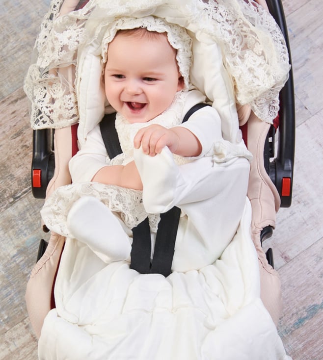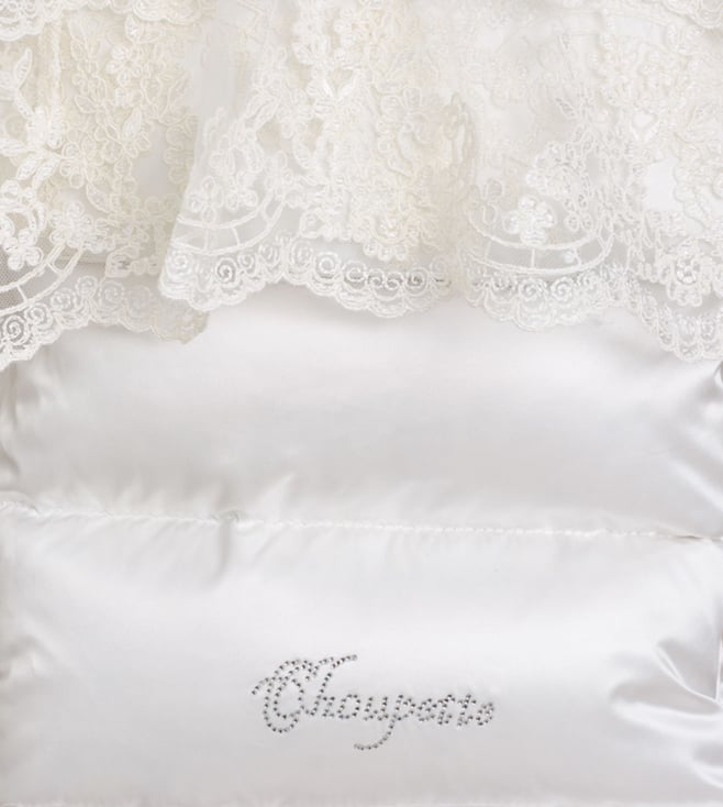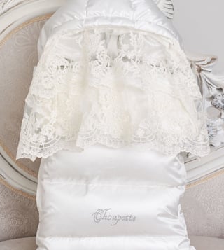 This sophisticated baby nest sleeping bag combines the softness of down filling with elegant French lace accents, offering a cozy and luxurious resting space for your little one. Designed to provide gentle warmth and delicate style, it ensures comfort and charm for peaceful sleep.