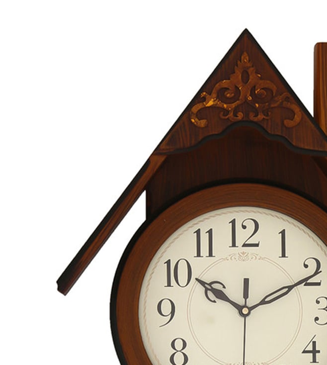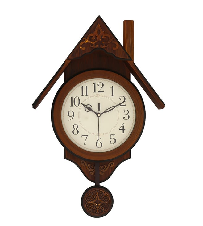 The wooden hut-shaped wall clock has perfect finishing and a pendulum too. It features Arabic numerals and durable mechanisms. This handcrafted clock is not only a good choice for your living spaces but also makes for a wonderful gift.