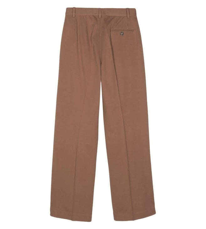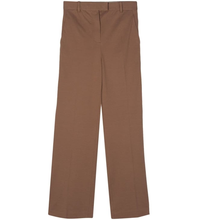 Elevate your wardrobe with the Circolo 1901 Brown Straight Fit Trousers. Designed with brown, cotton blend, piqu weave, pressed crease, dart detailing, low-rise, straight leg, two side inset pockets, rear button-fastening pocket, unlined, belt loops, concealed front button, hook and zip fastening, lining: cotton 96%, elastane 4%, outer: elastane 3%, these trousers combine comfort and sophistication for everyday wear.