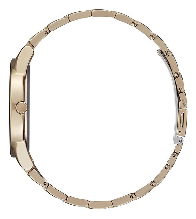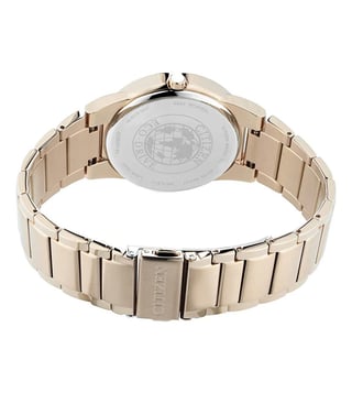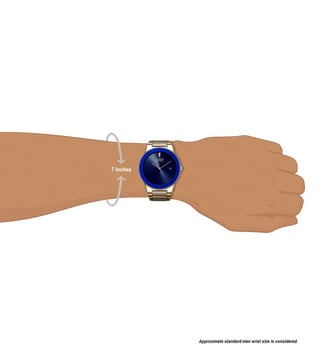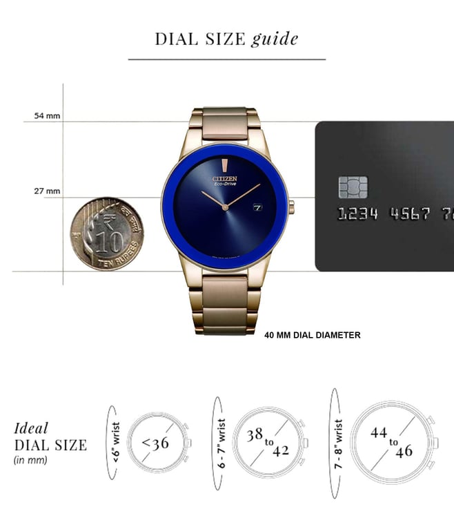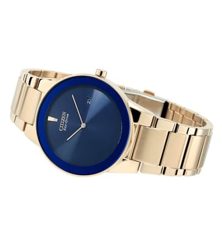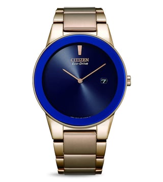 Combining style and functionality, this men's analog watch from Citizen will be a perfect pick for you. The stainless steel bracelet showcases a golden hue that uplifts the look of the watch. Working on an eco drive movement, the 40 mm blue round-shaped dial is encompassed in a stainless steel case. It features plain 2-hand functionality that makes it modern and durable. It is water-resistant upto 30 M. Furthermore, it is complemented with a push-button clasp that ensures a secure fit on the wrist.
