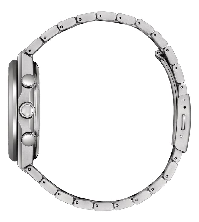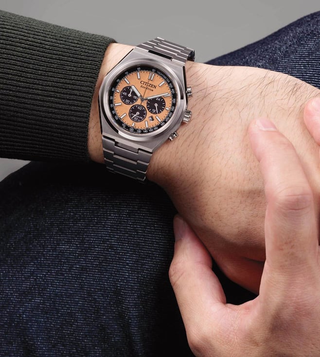 Pairing classic proportions with a distinctly modern style, meet the new Integrated Super Titanium series from Citizen. Featuring a 42.5mm silver-tone Super Titanium case paired with stylish stepped chronograph pushers and a stylized crown, the finely brushed and polished timepiece is secured to the wrist with a matching integrated bracelet. On the dial, a textured salmon color is accented with an outer tachymetric scale and triple register configuration in black, with details in silver-tone and white put to use for the handset and applied indices.