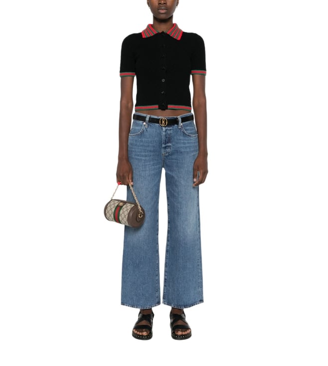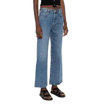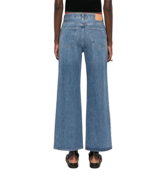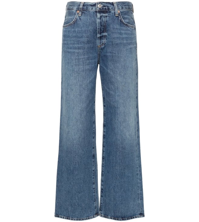 Elevate your wardrobe with the Citizens Of Humanity Blue Flared Jeans. Designed with blue, organic cotton, washed denim, contrast stitching, high-rise, belt loops, classic five pockets, rivet detailing, logo patch to the side, whiskering effect, full-length, logo patch to the rear, wide leg, front concealed fly and button fastening, these trousers combine comfort and sophistication for everyday wear.