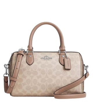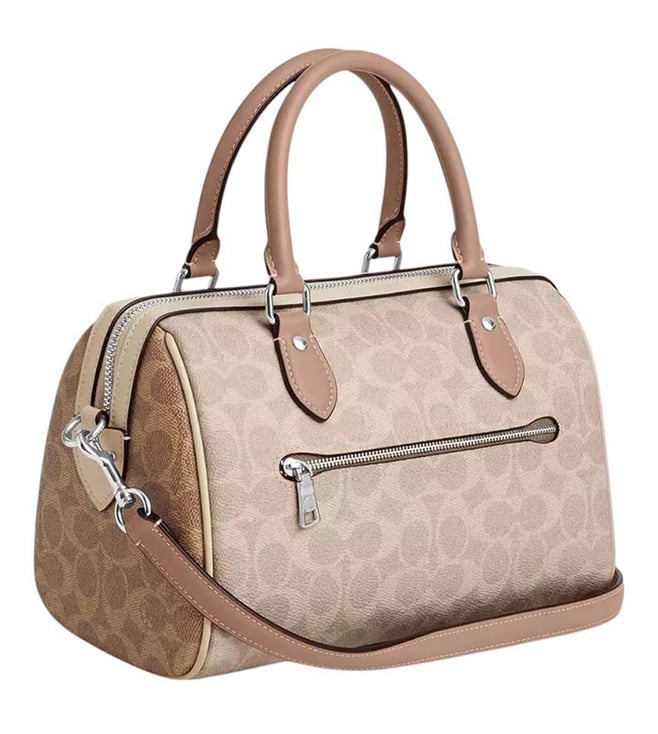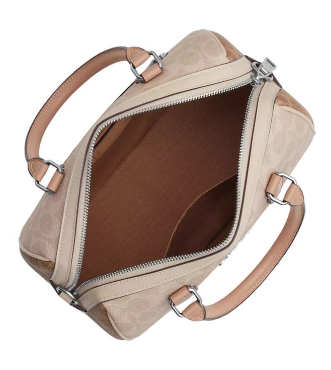 Coach beige rowan small satchel crafted in coated canvas and leather featuring zip closure, 1 compartment, inside zip and slip pockets, outside zip pocket, logo detailing, dual carry handles with removable shoulder strap.