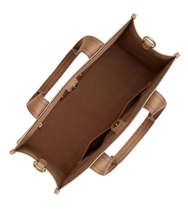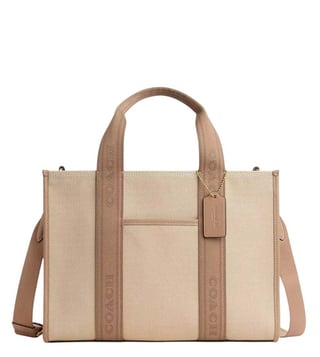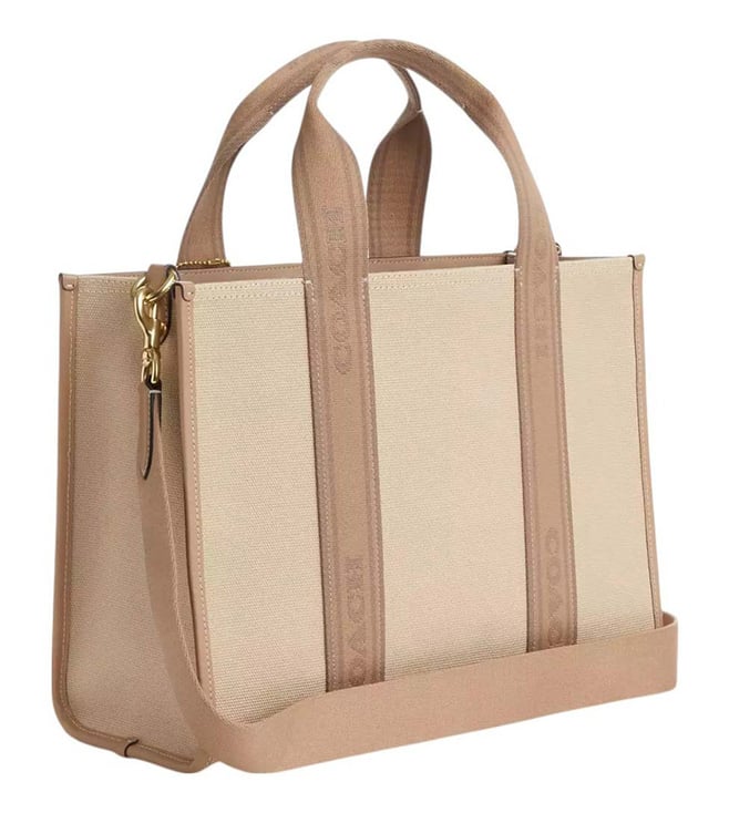 Coach Beige Smith Large Tote crafted in canvas and leather featuring snap closure, 1 compartment, inside zip and multifunction pockets, logo detailing, dual carry handles with removable shoulder strap. Products purchased from Darveys are supported exclusively by the warranty/exchange policies of Darveys and its partner boutiques. Brand owners and their channel partners are not responsible for exchange/warranty services for items purchased through Darveys.