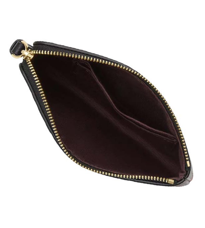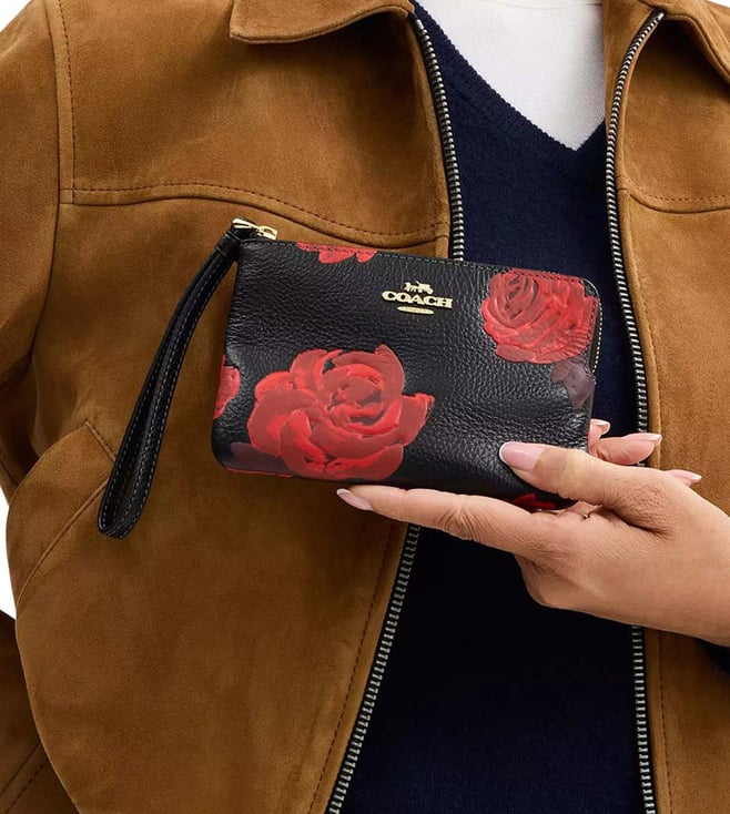 Accessorize perfectly with this black floral print corner zip wristlet by Coach crafted in leather featuring zip closure, 2 credit card slots, wrist strap and logo detailing. Dimensions: 15.87 x 10.16 x 1.27 cm. Products purchased from Darveys are supported exclusively by the warranty/exchange policies of Darveys and its partner boutiques. Brand owners and their channel partners are not responsible for exchange/warranty services for items purchased through Darveys.