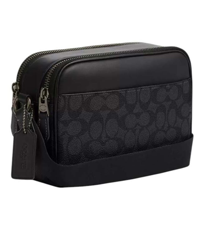 Coach black graham small crossbody bag crafted in coated canvas and leather featuring zip closure, 2 compartments, inside slip pocket, logo detailing, adjustable crossbody strap. Products purchased from Darveys are supported exclusively by the warranty/exchange policies of Darveys and its partner boutiques. Brand owners and their channel partners are not responsible for exchange/warranty services for items purchased through Darveys.