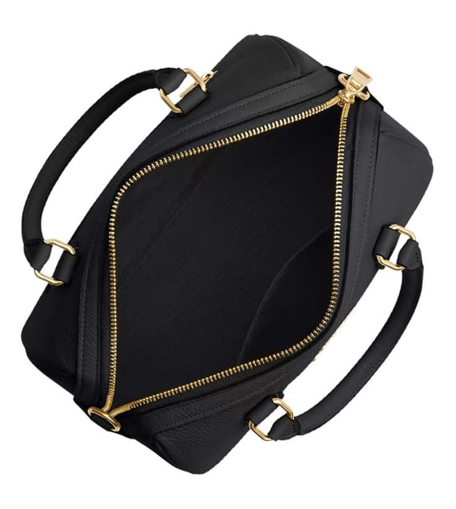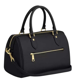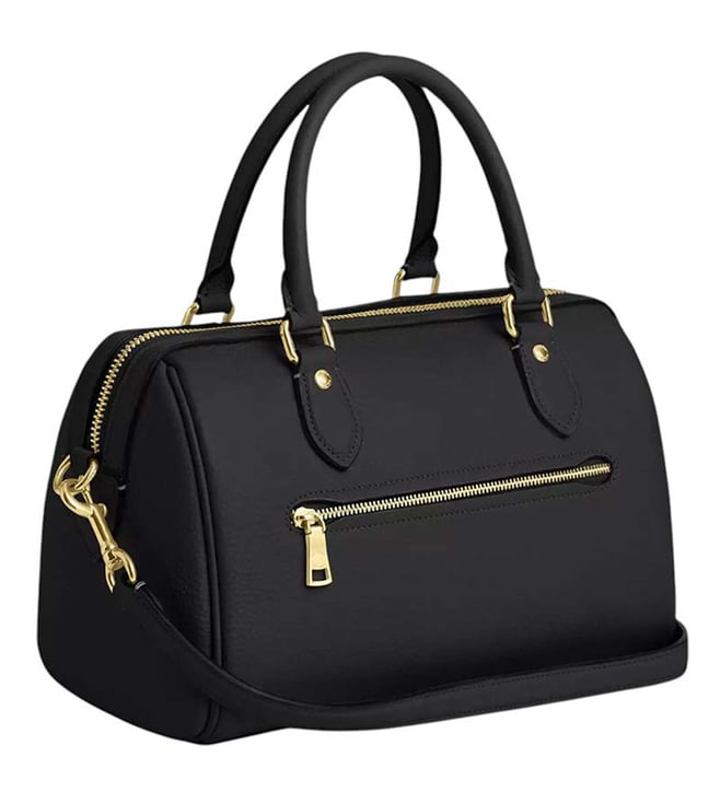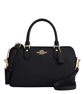Coach black rowan small satchel crafted in leather featuring zip closure, 1 compartment, inside zip and slip pockets, outside zip pocket, logo detailing, dual carry handles with removable shoulder strap.