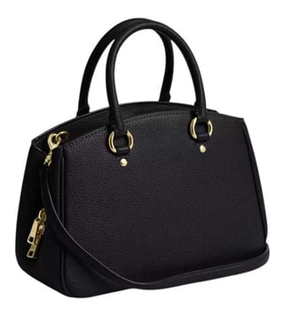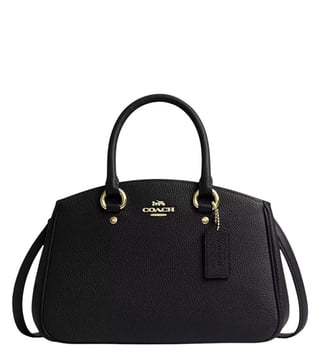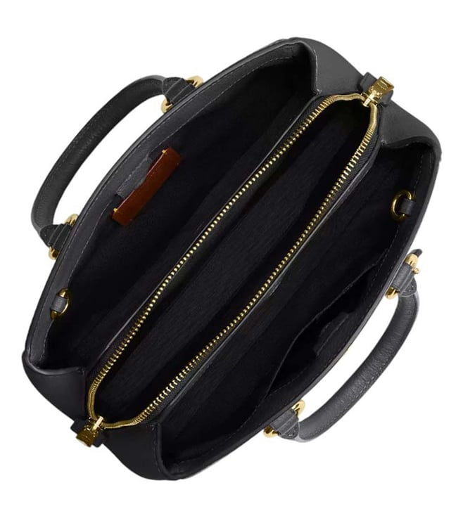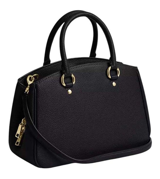 Coach black savannah carryall small satchel crafted in leather featuring magnetic snap closure, 2 compartments, center zip compartment, inside slip pockets, front logo, dual carry handles with removable shoulder strap.