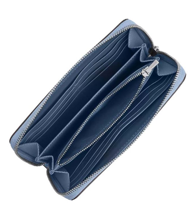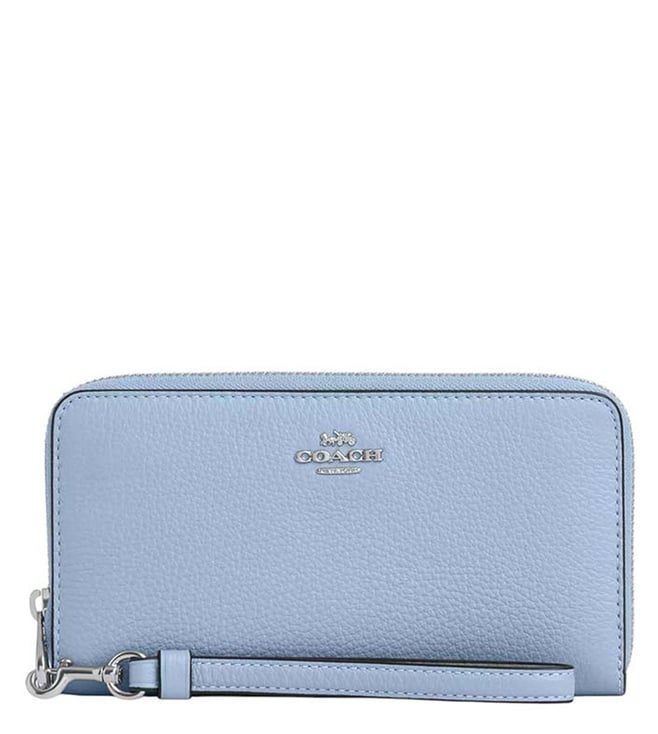 Accessorize perfectly with this blue logo zip around wristlet by Coach crafted in leather featuring zip closure, 12 credit card slots, zip coin pocket, wrist strap, bill compartment and logo detailing to give you a luxe appeal.