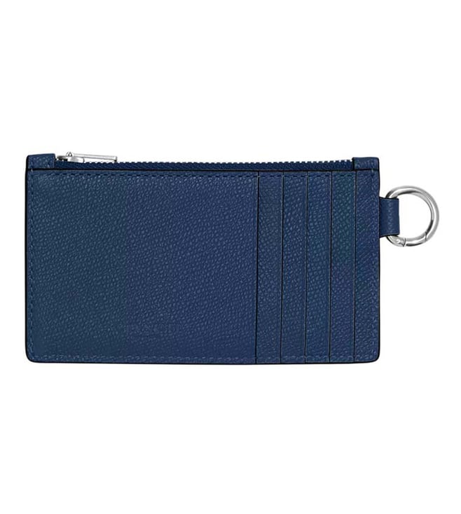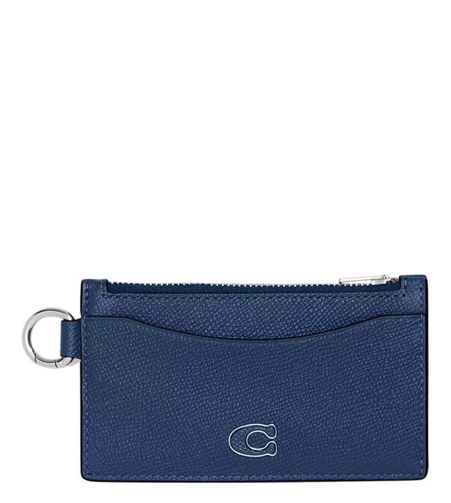 Accessorize perfectly with this blue logo zip card holder by Coach crafted in leather featuring zip pocket, outside open pocket, five credit card slots, attached hinged d-ring and logo detailing to give you a luxe appeal. Products purchased from Darveys are supported exclusively by the warranty/exchange policies of Darveys and its partner boutiques. Brand owners and their channel partners are not responsible for exchange/warranty services for items purchased through Darveys.